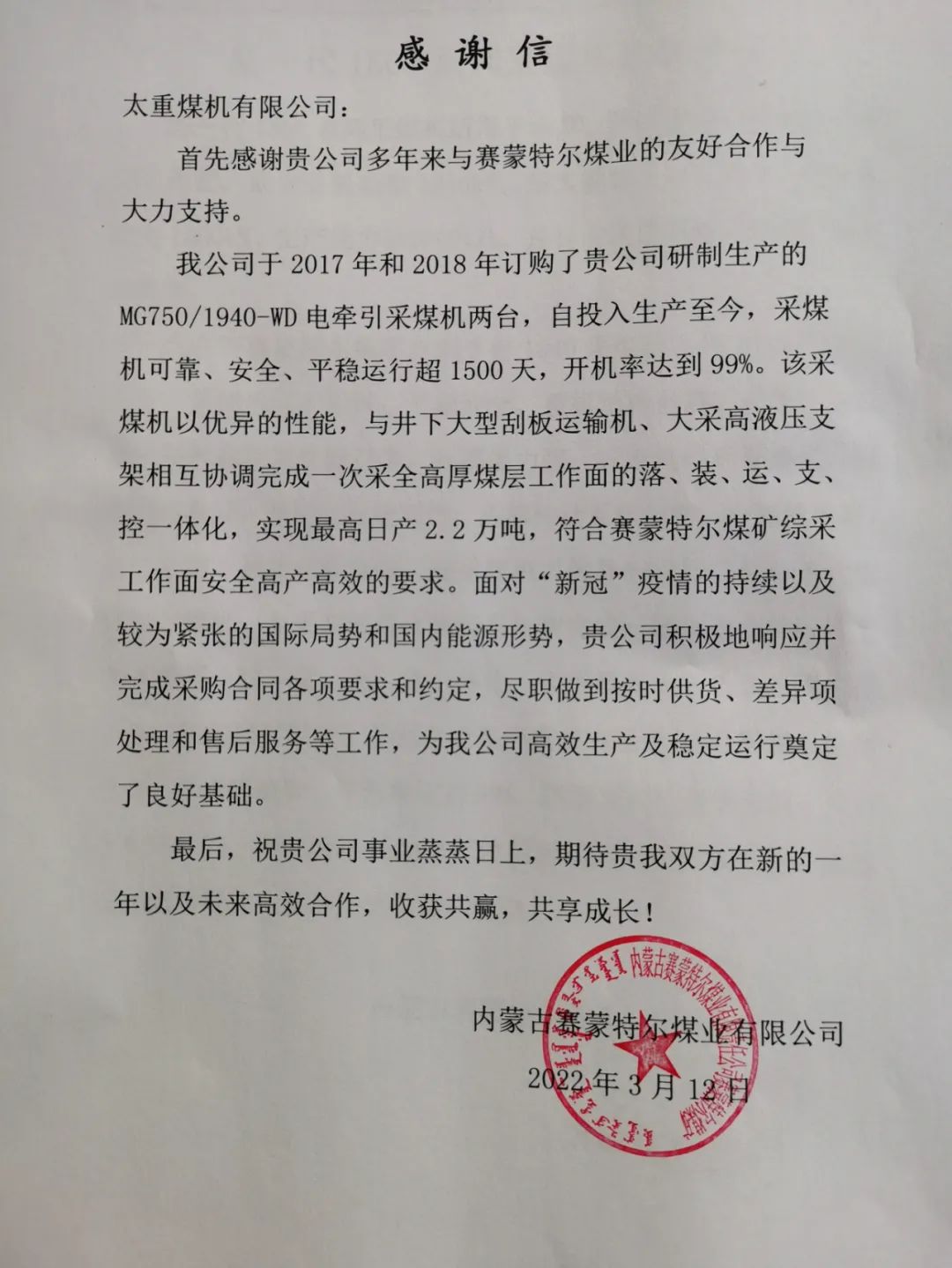 近日,公司收到内蒙古赛蒙特尔煤业发来的感谢信,信中对太重煤机生产制造的采煤机给予了高度赞扬。信中表示,2017年和2018年订购太重煤机两台MG750/1940-WD电牵引采煤机,投入生产至今,采煤机可靠、安全、平稳运行超1500天,几乎零故障,开机率达到99%,实现最高日产2.2万吨。特别是当下新冠疫情期间,太重煤机利用各种形式开展技术交流与售后服务,想用户所想、急用户所急,第一时间到矿积极售后服务,充分彰显了太重煤机“用户至上”的核心价值理念。期待与太重煤机能进一步深入合作,互惠共赢。