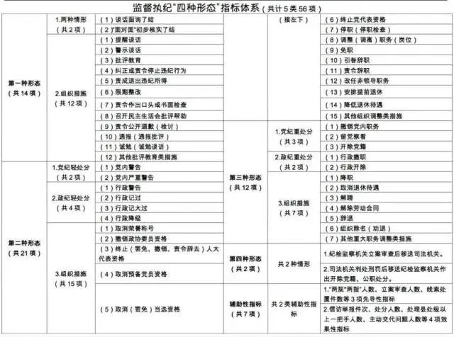 中央纪委办公厅2017年还专门印发了《纪检监察机关监督执纪“四种形态”统计指标体系(试行)》,设置了5类56项统计指标。(将谈话函询了结、“面对面”初步核实了结、诫勉谈话等14种“红脸出汗”的情形设置为第一种形态指标。将党内警告、党内严重警告、免职等21种纪律轻处分和组织调整措施设置为第二种形态指标。将撤销党内职务、留党察看、开除党籍等12种纪律重处分和重大职务调整措施设置为第三种形态指标。将纪检监察机关立案审查后移送司法机关等2种严重违纪涉嫌违法的情形设置为第四种形态指标。此外,为了从不同侧面反映实践“四种形态”的发展趋势和总体成效,在上述49项基础性指标之外,还设置7项辅助性指标,包括线索处置件数等3项先导性指标以及主动交代问题人数等4项效果性指标。)